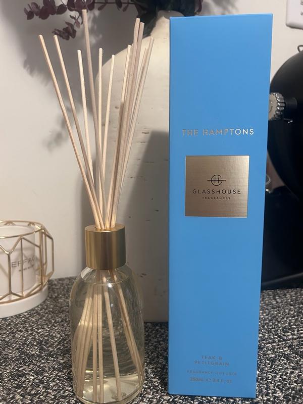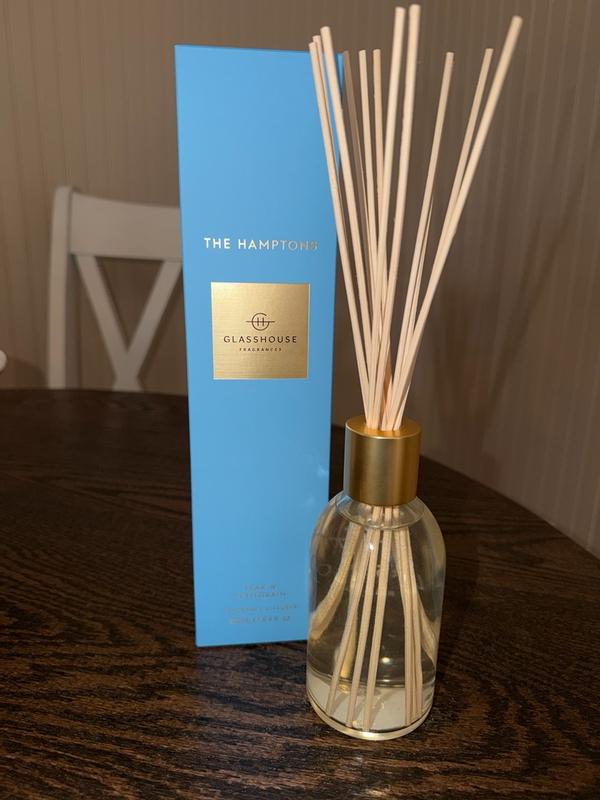I received this Glass house fragrance diffuser in the Hamptons scent. The presentation was beautiful, it came in this pretty light blue box. The product itself was pretty easy to set up and use (not heavy). So far the scent has been a pleasant clean with a soft musky undertone. The scent throw is pretty good, the scent has lasted a decent amount in the room where I set it up. The glass jar and diffuser components are easy to keep clean, they add a nice touch to my bedroom- it looks pretty on my vanity.