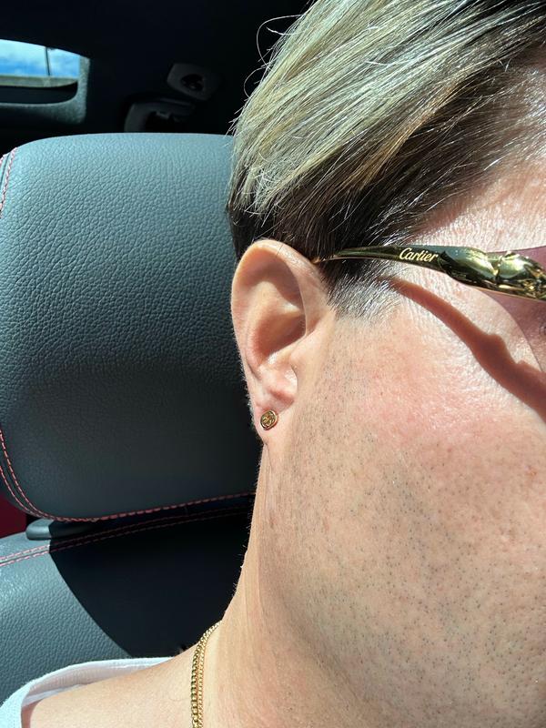 They’re slightly smaller than the running g studs, but just perfect for casual every day wear. I love the thickness of it and it feels secure. I have worn it daily even in the shower and it still shines while feeling secured without the pinch.