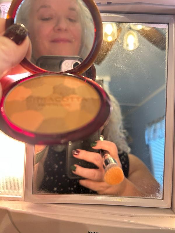 The terracotta light healthy glow lives up to it’s name! I have light skin and sometimes it’s needs a little something. I use this product on busy mornings when the full contour/highlight routine is not going to happen. I sweep it around my frame, under cheekbones and jawline. The color is natural. It’s buildable in layers, I use more for evening looks but it doesn’t sit in my fine lines. It does shimmer ever so slightly in the light. The compact is slim and easy to bring along. But it stays on well so reapplication was hardly necessary. It didn’t have ant scent that clashed with other products. This is a convenient product, just needs a good fluffy brush to apply.