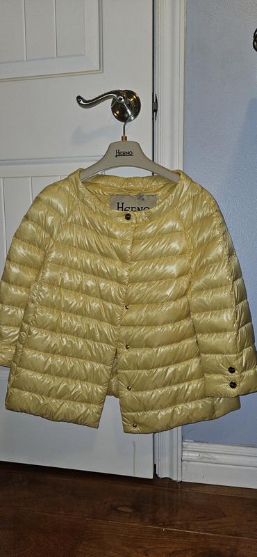 Purchases my first 2 Hernos. Got this style in Giallo Limone, beautiful yellow. I love the boat neckline and the buttons on the sleeves. I'm usually a size S, but got this in size 42 IT/6 US so i can layer during colder months. Gorgeous & stylish coat, light medium weight, provides warmth but not heavy or puffy which I prefer. Wears on beautifully! Love my Herno purchase!