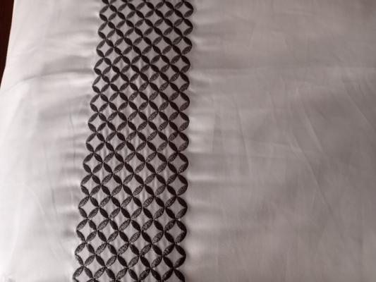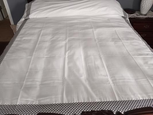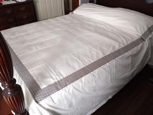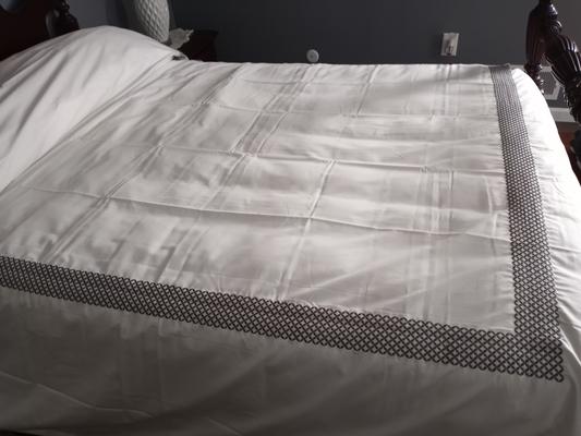 Beautifully packaged, this was like unwrapping a gift! The weight and feel of the Pima cotton is impressive. It is very soft and has a silky look and feel. The touch if geometric design around the edge adds a nice pop if color. My bed is a full, so it runs around the edges. I will purchase the shams to complete the look.