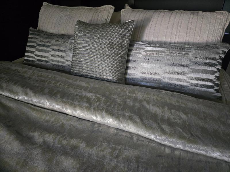 This is another Hudson Park fabric that you have to see in person, because it doesn't translate well in photos. Looks like shiny silver white birch bark. I wish I knew what the third pillow was in the photos. We paired with a coverlet from Macy's.