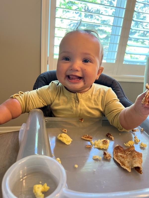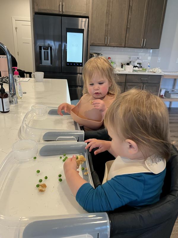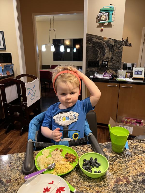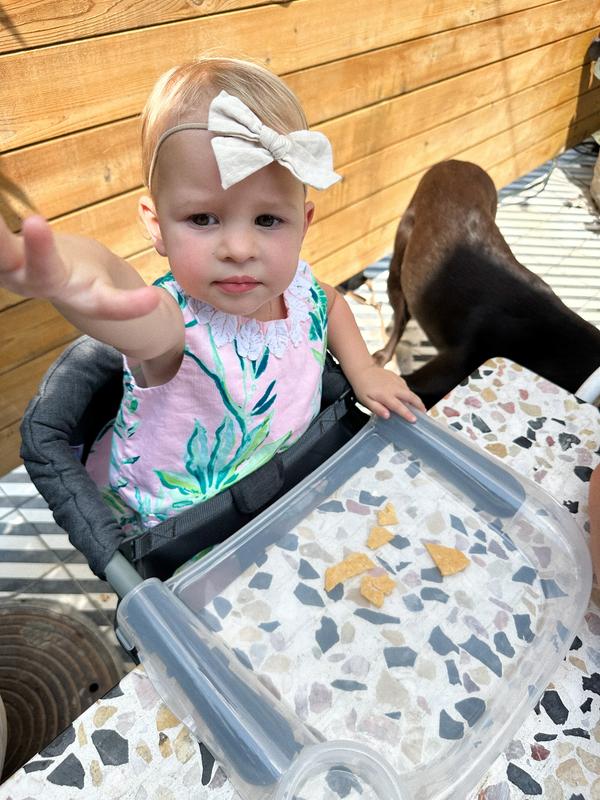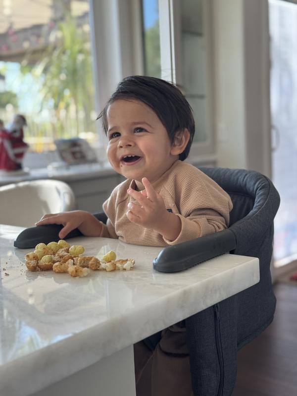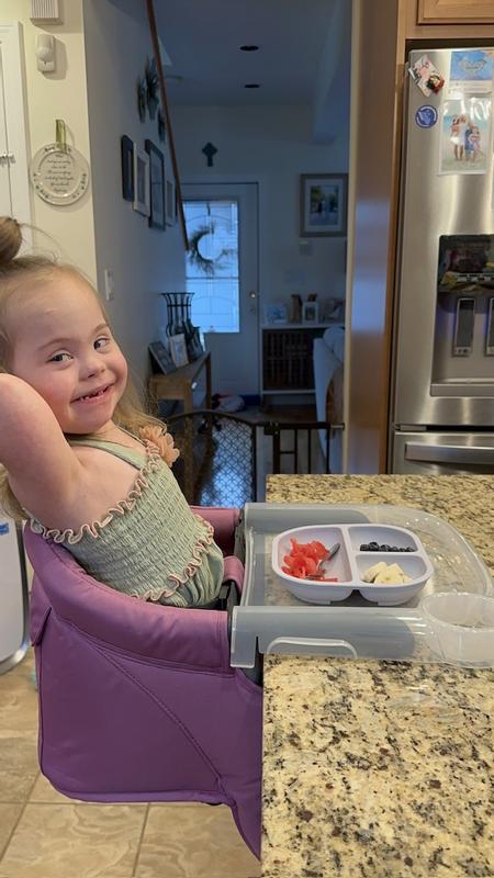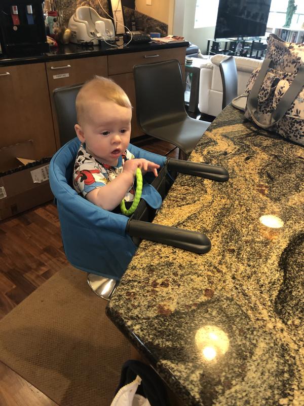 Once you find a table it can attach to, this product works wonders. I love how compact it is and how my son feels like he is part of the meal with us at the dinner table. It's also machine washable.