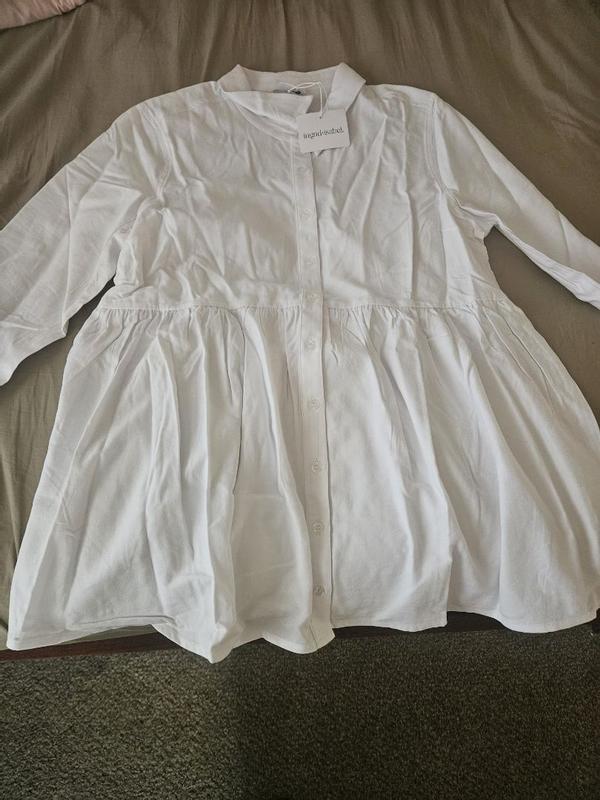 Comfortable button down. Bigger than I thought it would be but fits perfectly. Easy to feed baby in just unbutton and button back up. Not see thru so that's great for it being white.
