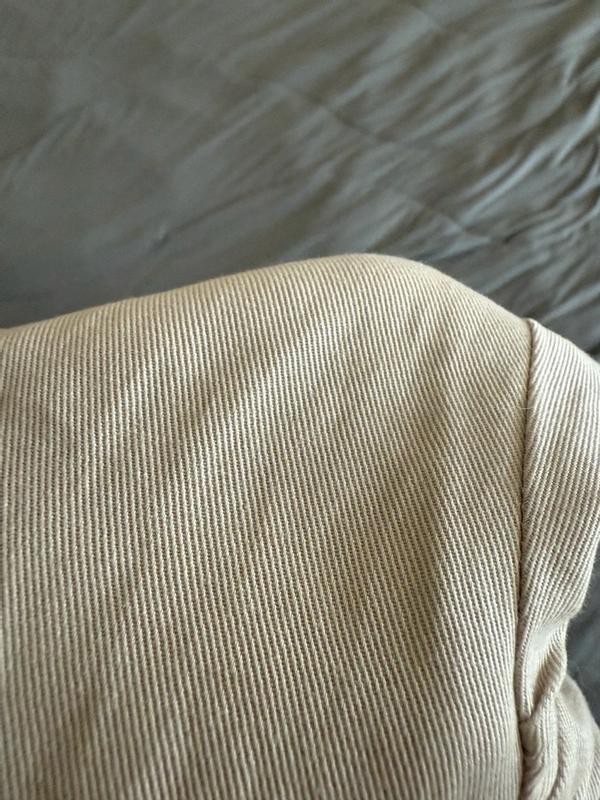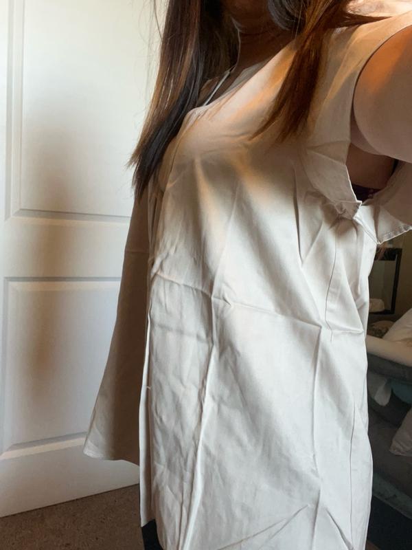 Great quality and the texture feels nice, but it is a little short on me (I’m 5’10). Wrinkles easily but not too hard to get them out. Very cute styled with jeans.