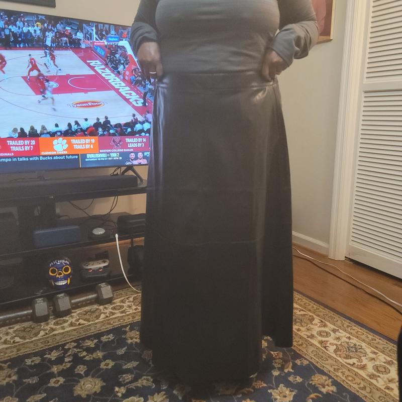 This skirt was exactly what I expected it to be. It is long, true to size and the vegan leather feels so soft. Great quality for the price. This feels like a luxury item and investment piece.