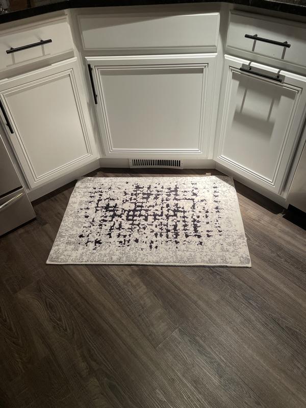 I have this rug in front of my patio doors . My dog goes in and out of that dog . He drags in mud, dirt and lots of sand . The rug helps contain the mess, and looks great . Love the abstract design and muted colors of gray,white,cream black .
