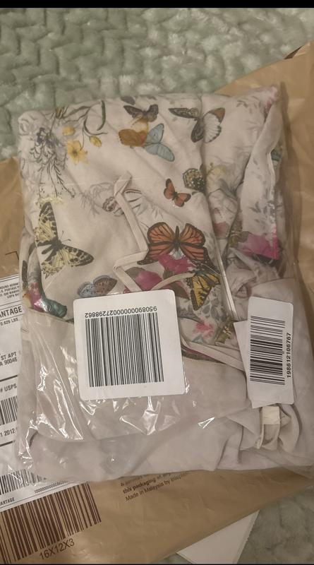 The dress is beautiful, however came rolled up in crinkled used tissue with scotch tape in a filthy plastic shipping pouch. I would expect better packaging from Bloomingdale’s … definitely will be calling customer service.