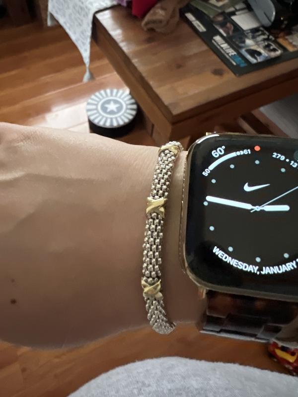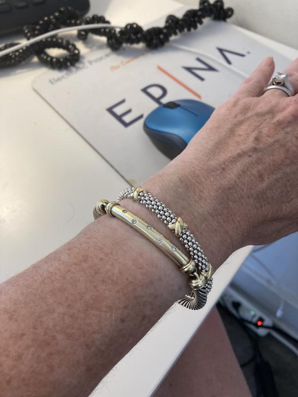 I was looking for an everyday mixed silver-gold bracelet. Although nice, I ended up Replacing with another bracelet from John Hardy that I preferred. Silver is a little too shiny for my taste.