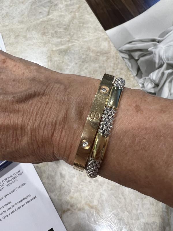 Love this bracelet and the gold bars makes it easy to wear with yellow or white gold jewelry, goes nicely with my smart caviar bracelet for Apple Watch