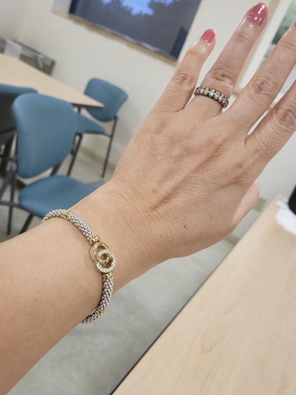 Bracelet is gorgeous. Very classy and compliments any attire you have with the two tone. I wear it on the same wrist as my watch and it looks lovely. I get many compliments and the closure is safe so it will not fall easily from your wrists like other bracelets do. I highly recommend this bracelet!