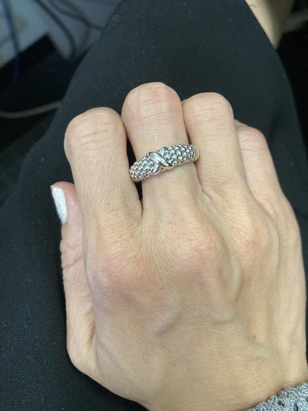 The ring has the 'caviar' silver pattern and a pretty center decoration in the shape of an X. I purchased it together with the matching bracelet and it looks upscale yet also can be worn casual. Easy to combine with other Lagos jewelry