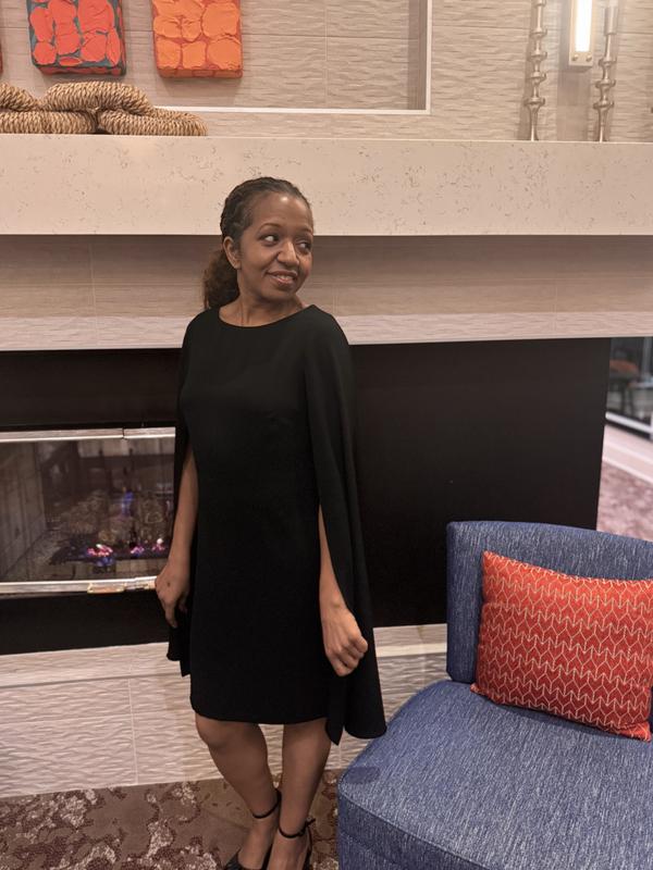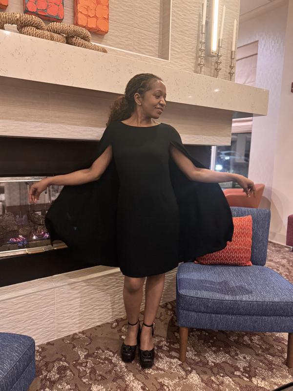 Beautiful, classy and elegant are just some of the words that come to mind when describing this Ralph Lauren design. I tried the dress in crème and black and preferred the black. The cape like sleeves make it stand out and gives it a dramatic flare while covering the arms. Highly recommend. It is true to size. I am 5’9” 140 lad and size 8 fits perfectly.