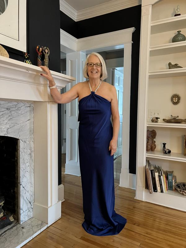 This was my runner up dress for a formal wedding. Gorgeous color and drapes beautifully. *Loved* that it was a slightly relaxed fit — *very* flattering, lengthens the body. I was less “sold” on the chain halter. Easy to open/close but very plain and utilitarian up close. Wish the chain had been dressier or more delicate to enhance the dress. A little tricky to get into (lining doesn’t stay put.) If you are traveling with this dress, pack carefully and be prepared to steam out wrinkles if needed — the material creases somewhat easily.