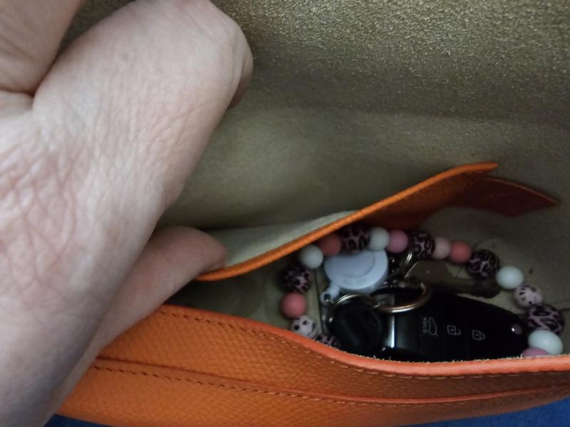 I love the color of this bag! Perfect size for what little I carry. (Keys, small card case, name badge and Samsung 23S Ultra mobile phone). Trying to close the bag with the loop is a pain so I don't ever "lock" it.
