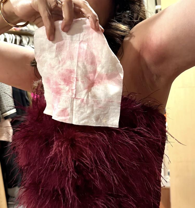I purchased this for my birthday dinner, but just before leaving, I noticed the underarm and sleeve areas had turned bright red—the color was bleeding. I had to scramble for an alternative outfit and couldn’t wear it. Considering the price point, the quality is disappointing. The material feels poorly made