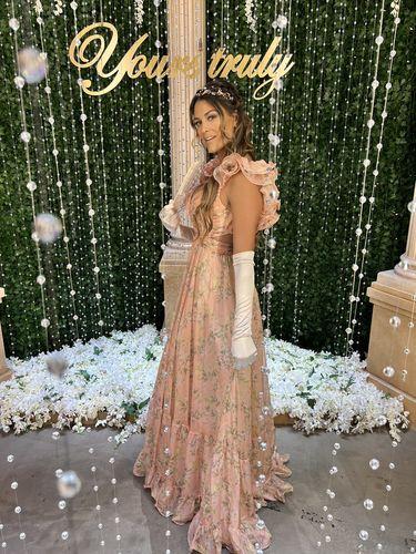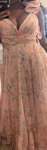 This is most beautiful romantic dress! I wish all my bridesmaids could afford it to wear as my bridesmaids. I chose to wear to my welcome dinner to give a break from all my white looks. I got an XS, I’m 5’4, had to get it shortened. I’m 32c, 115lbs. A little small in the bust, but the small was too big and didn’t want to swallowed in the dress because shoulders are heavy.