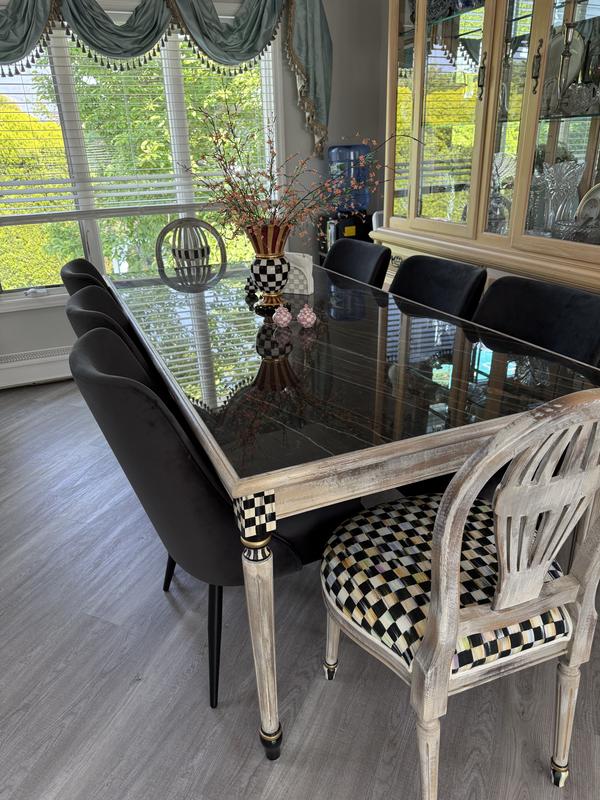 I bought two of these chairs to accent the Mackenzie Childs farm table. They are not just stunning but are so comfortable! They add the right amount of pizazz to both ends of the table. So glad I made this purchase!