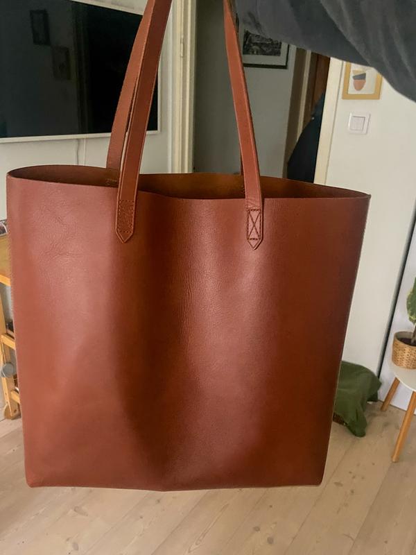 I have been stalking this Transport Tote for quite a while. I originally bought one from secondary market seller and absolutely loved it. When I saw this one go on sale on the Madewell site I knew I had to have a backup bag ! This is by the way, a carbon copy of the one I previously purchased. The bag has enough structure that it stands on its own. However, I think over time, the leather will soften. To counter that possible effect, I purchased a bag insert from Letherology that's made to be inserted into their totes to be used as a diaper bag. This is the answer to your organizational prayers for a large, open tote bag.Back to my obsession, the Transport Tote. The leather is thick full grain, a beautiful color of Cognac Brown. There is no transfer of the dyes onto clothing, and it has the rich smell of high-quality leather. This may be the best thing I have purchased all year. Thank you. Madewell.