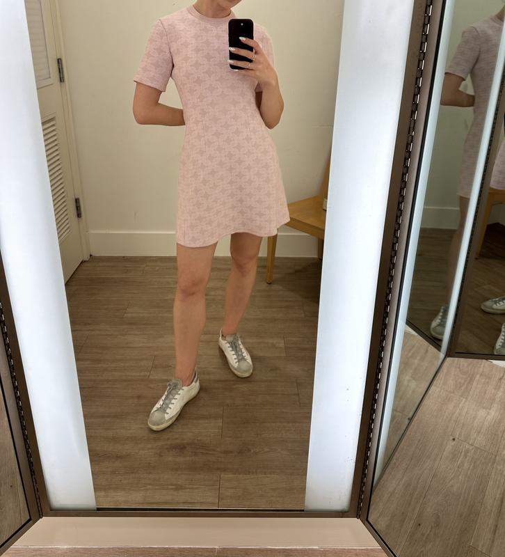 This is a darling dress! The material is somewhat heavy but stretches a bit and is very flattering. It has a nice little sparkle and the pale pink is perfect. It fits TTS but a bit fuller on the bottom. Very versatile as it can be perfect for a dinner party but ok aa well for a lunch with the girls.