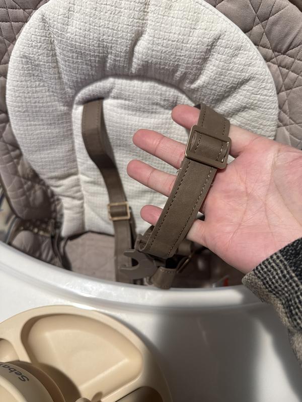 This chair is very uncomfortable for my toddler, he is 1 year and 4 month he can't barely stay in the chair I see his feet are hanging and he try to pull them back for support. The chair is beautiful design looks sofisticated very easy to set up and I love the facts you can reorder the back support and straps. Straps after a year the sewing comes off and starts coming apart. I reach out for support maybe there was an adaptor but no response over a week.