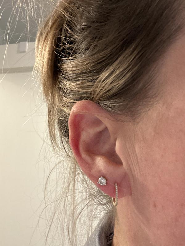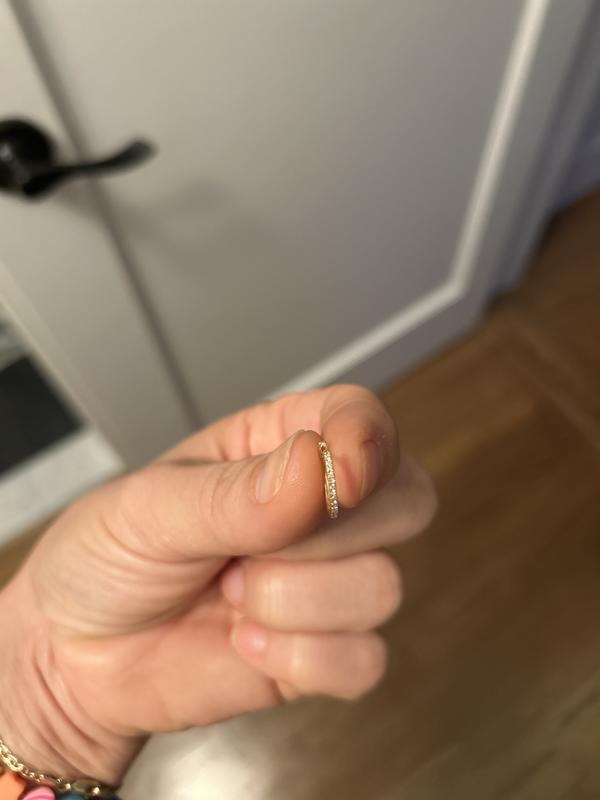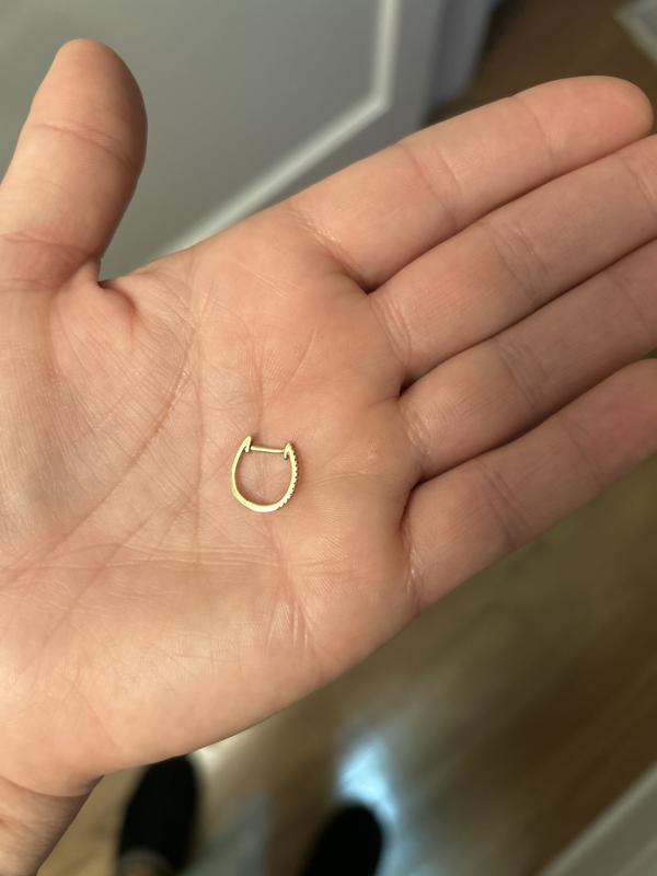 Cute perfectly dainty huggie! Note these are small, but they’re supposed to be! The pictures don’t show it, but the diamonds sparkle nicely, and the yellow doesn’t look as cheap in-person. The huggie’s diameter is just long enough to fit around my earlobe.