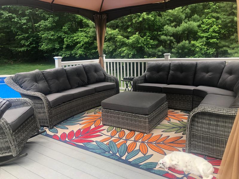 This rug looks wonderful on our outdoor patio. It is colorful and blends well with our furnishings. We shopped around for quite a while until we saw this online and now we're glad we didn't settle for less.