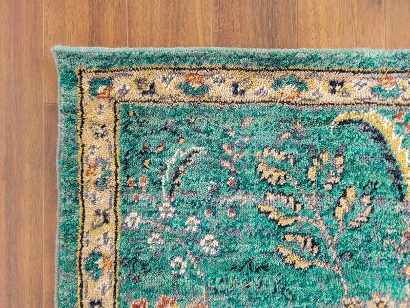 A beautiful soft rug. I loved the colors included in the rug which drew attention to my paisely cloth dining room chairs. The dark and light teal with gold enhanced the look.