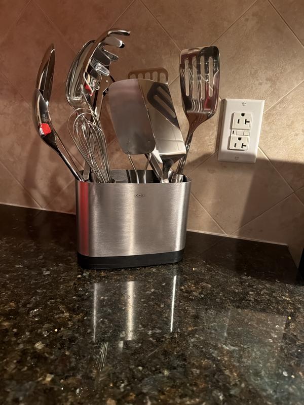 After owning this kitchen utensil set for two years, I wanted to write an honest review of my experience. The utensils themselves are reliable and durable. I haven’t had any issues so far with any of the utensils that I’ve purchased, and all still hold up to OXO-level quality. Admittedly, I use some utensils more than others based on my cooking habits: 12-Inch Locking Tongs, Lasagna Turner, Pizza Wheel, Whisk, Serving Spoon, Slotted Spoon, etc. All of which have held up over the years and are very durable. However, I can’t bring myself to give this set 5 stars due to the utensil holder it comes with. I’m planning to keep the utensils but find myself back in the market to find an appropriate utensil holder. In short: the utensil holder is not dishwasher safe and is not large enough to easily hold all of the utensils this set comes with. Unless each utensil is carefully placed into the utensil holder in a specific order, this utensil holder cannot fit all utensils in a functional way. If you are anything like me, you do not typically take the time to organize your kitchen utensils after each use. After grabbing a utensil or two, using them, and washing and drying them, my intent is to place the utensil(s) back into the holder without much organization necessary. That is what typically makes a utensil holder convenient and functional in a home kitchen. However, that typical process does not work with this set. I constantly find myself being unable to fit utensils into their original spot due to the limited space this utensil holder allows. If I am short on time and simply try to place the utensils back into the holder, it looks cluttered and does not fit everything as it should. Utensil holders are typically on display in home kitchens such as rested on the kitchen counter, like mine. Since it is out in the open and was a bit pricy, I hoped it could be a nice stainless steel accent in my kitchen. I’ve resorted to storing some of the OXO utensils in this set in other areas of my kitchen as I use them frequently. Many do not find a cluttered/cramped utensil holder to be visually appealing, and for that reason I won’t consider this holder to be “easy accessible” or any kind of set you can “grab and go” with. As far as the utensils go, I highly recommend them as they are durable and have held up perfectly over the years. However, you may find yourself in the market for a utensil holder after using this one for some time, as you’ll likely find yourself organizing it a few times per week. Some have the time to do this or don’t mind making the time to do so. In the future, I hope this set is re-released with a larger, functional utensil holder.