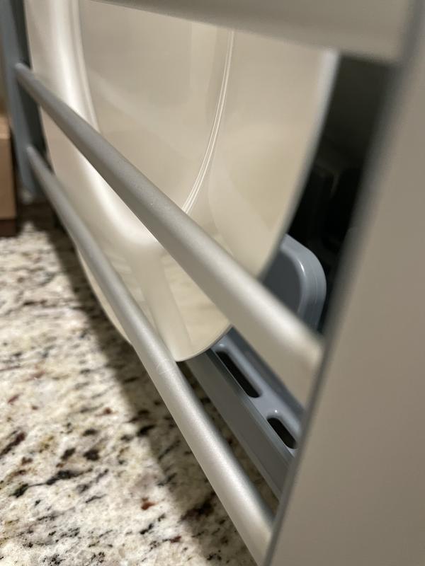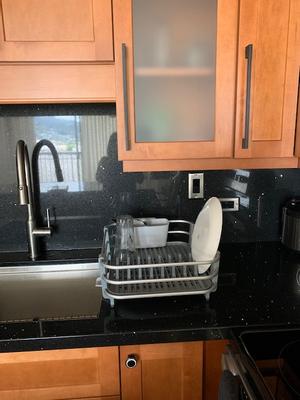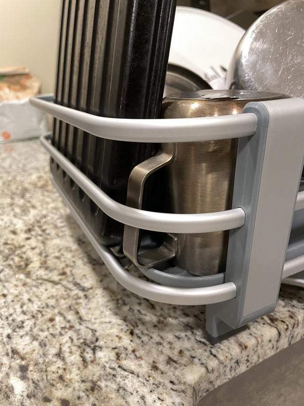 This looks handsome in our kitchen. Because it's aluminum, it won't rust, which is nice. However. It lacks slots for glasses and cups, so it's smaller than it looks. Also, the drain tray underneath the rack is inconveniently in two pieces. Worst of all, OXO recommends running it through the dishwasher once a week! That's just unrealistic for us. (I do detach and clean it every few days, but having to detach it is another inconvenience. ) I would not purchase this again.