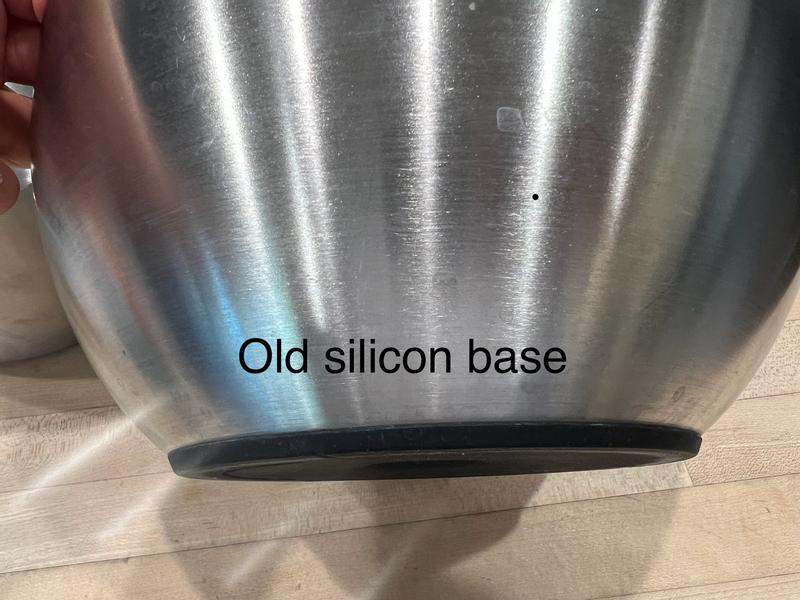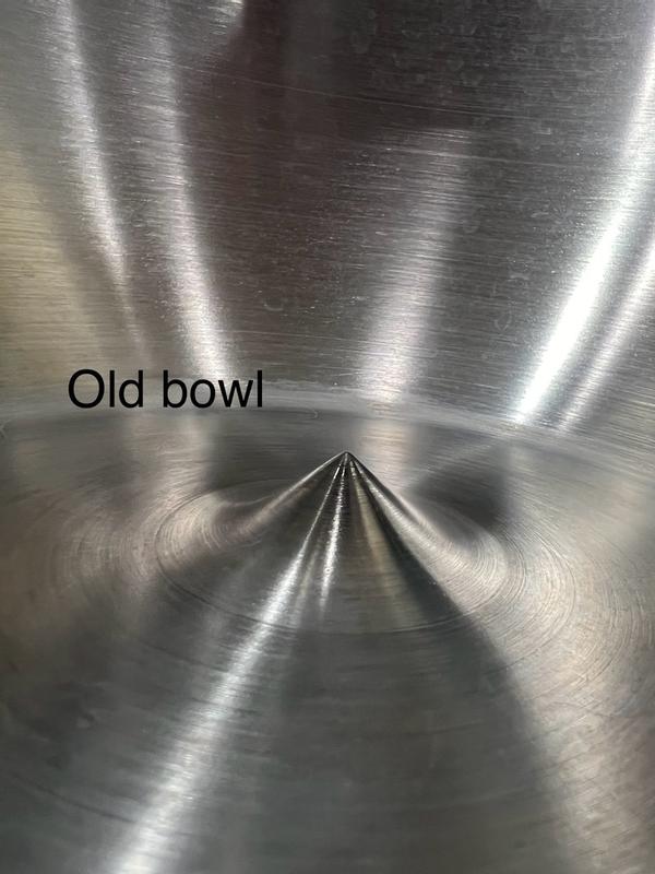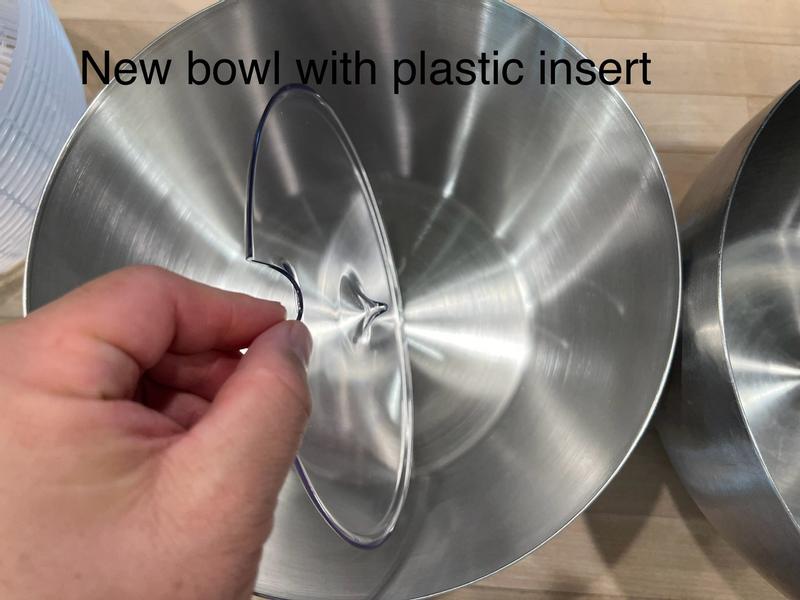 There’s been a very annoying redesign of a previously excellent item. The old version had a point built into the base of the bowl; the strainer spins on that point. The new version has a flat-bottomed bowl, with the pivot point built into a removable plastic disc which sits in the bottom of the bowl. The problem is that the plastic disc traps food and liquid underneath itself, and has to be removed to get the bowl perfectly clean. Also, the disc falls out whenever the bowl is turned over, and is difficult to remove for cleaning—it’s an entirely unnecessary complication.