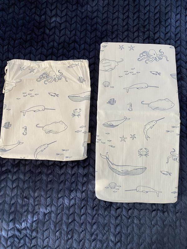 Bought this as a gift for my future nephew, came packaged nicely with a matching reusable drawstring bag to protect the sheets. The aquatic print will match with the nursery well
