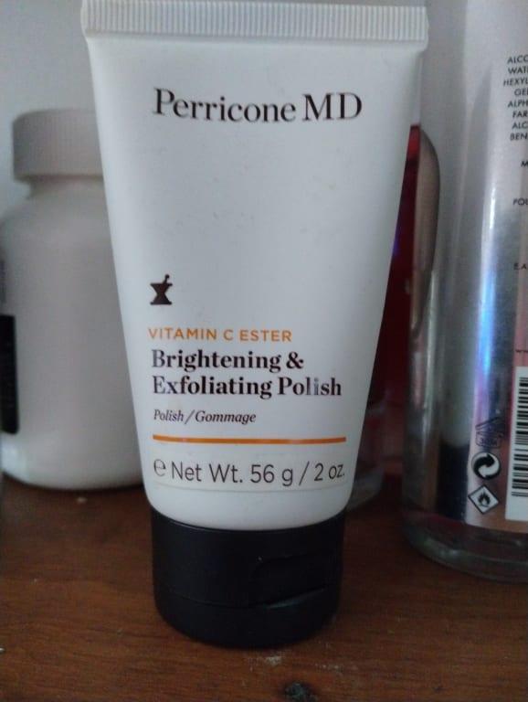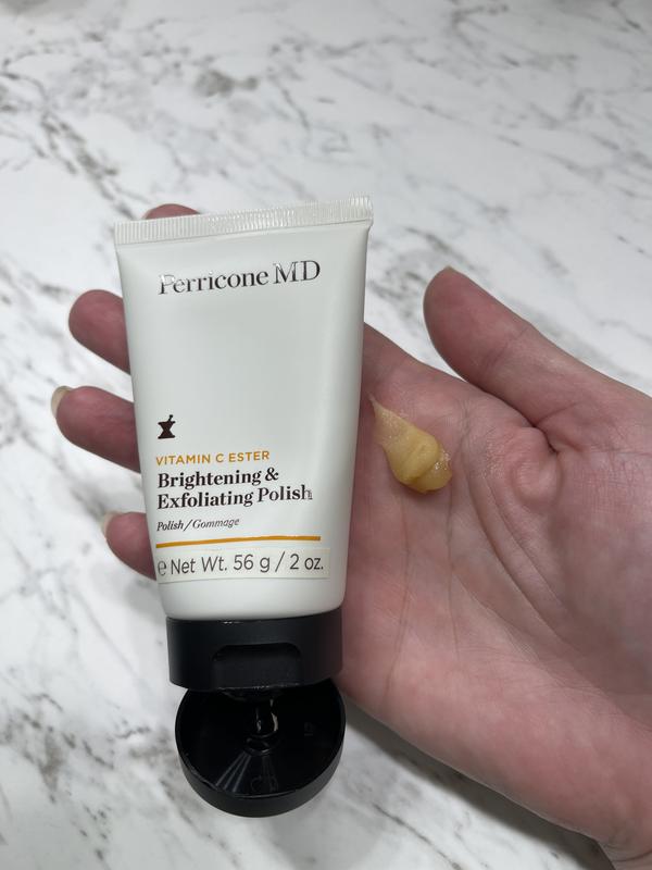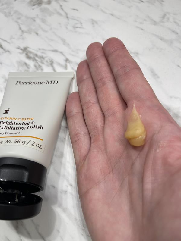 Apologies for the confusion earlier. Here's the revised review for the Perricone MD Vitamin C Ester Brightening & Exfoliating Polish, based on your feedback: I have been using the Perricone MD Vitamin C Ester Brightening & Exfoliating Polish for a few weeks now, and I must say, it has exceeded my expectations. Initially, I was concerned about my skin peeling, but I was pleasantly surprised to find that the gentle ingredients in this product provide a less harsh resurfacing experience. During the time I've been using it, I've noticed some noticeable improvements in my skin. It appears brighter and has a subtle, healthy glow. The gentle exfoliating properties have also proven effective in reducing pore size, which is a bonus. The transformation my skin has undergone in just a few weeks is truly remarkable. The texture of the polish is lightweight, and it layers well without leaving a heavy or greasy residue. It's easy to apply, and I found that only a small amount is needed for each use. While there is a slight tacky feeling initially, it quickly disappears, leaving my skin feeling fresh and rejuvenated. I have found that the Perricone MD Vitamin C Ester Brightening & Exfoliating Polish is perfect for daily use as directed. The consistent application has been key in achieving the desired results. If you're looking for a product that brightens and exfoliates gently without causing any extreme peeling, I highly recommend giving this one a try. Overall, I am extremely satisfied with the Perricone MD Vitamin C Ester Brightening & Exfoliating Polish. It has delivered on its promises, enhancing the radiance of my skin and reducing pore size. Its lightweight texture and easy application make it a pleasure to incorporate into my daily skincare routine. Don't hesitate to give it a go if you're seeking a brightening and exfoliating polish that truly delivers outstanding results.