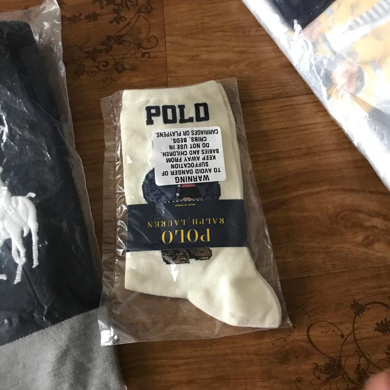 This ivory socks with the RalphLauren bear are timeless and as cute as can be! Comfy, casual and perfect!!