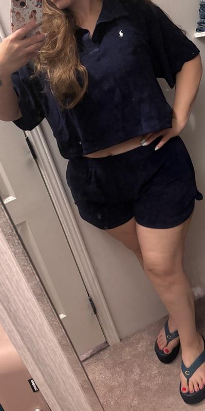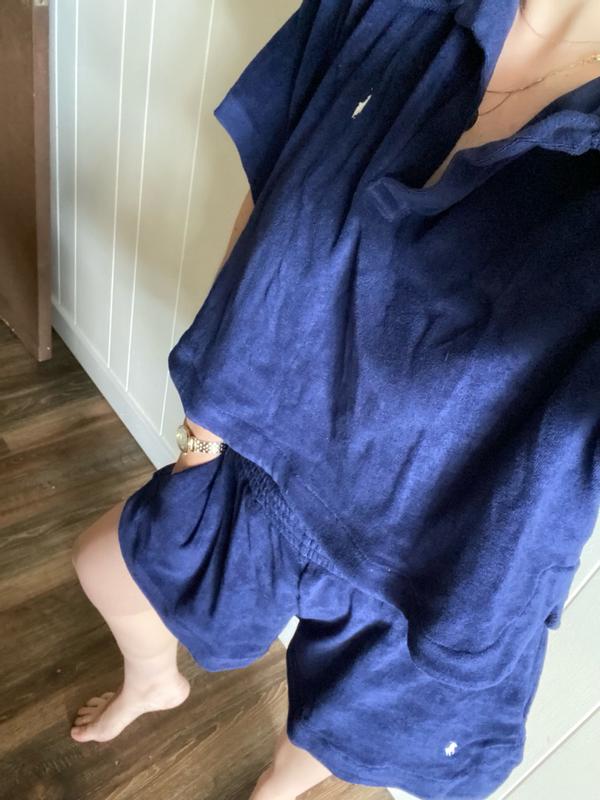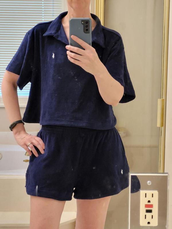The Polo Ralph Lauren terry does not disappoint. The material is soo soft!! a plush towel but way more breathable. It feels super luxe without being heavy or hot, which is exactly what I need for beach days and/ or poolside lounging. The shirt has a cropped oversized relaxed fit that gives off retro resort vibes, especially with the open collar. The shorts are the perfect length, flattering but not too short, and not to brag but I have a big butt and this covered all of it! It does have a drawstring waist that makes them super comfy and easy to slip on over a swimsuit. I’ve worn the set together for brunch right after leaving poolside. I got so many compliments, it just feels put together without trying too hard. Oh! And the color, love this deep almost navy blue color!😍 Fit: slightly oversized Use: Beach, resort wear, lounging Would I buy again? Absolutely!