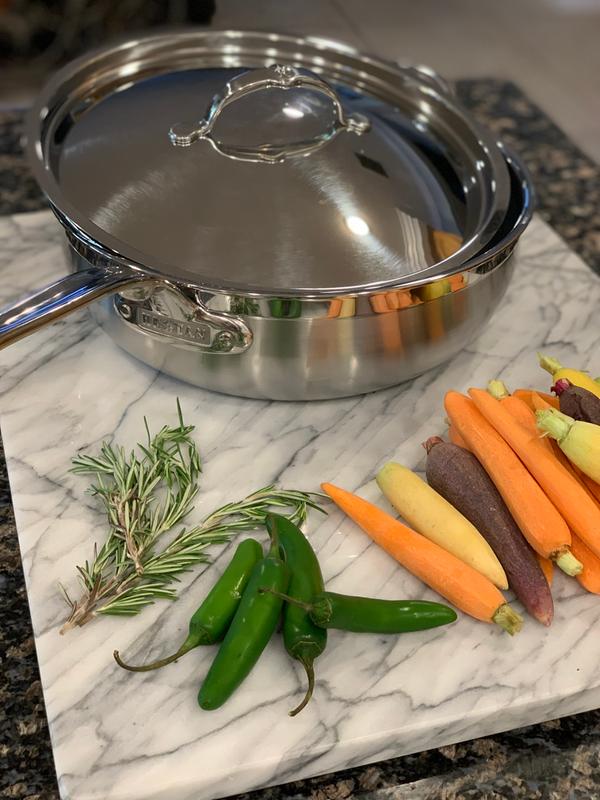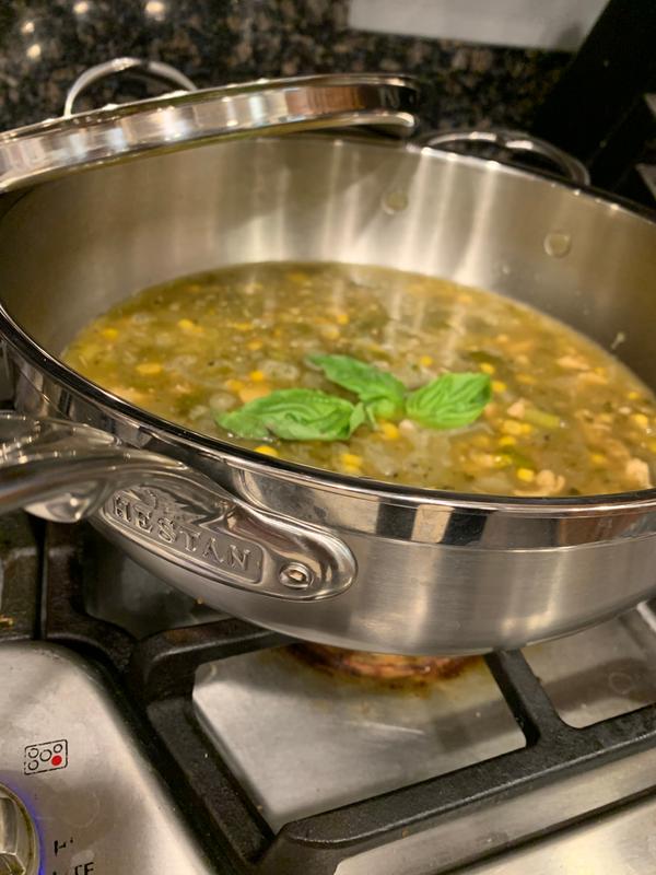 Hestan has the best quality products i own the hestan 42 inch gas grill and OvenBond Tri-ply Quarter Sheet Pan with Rack and the stainless steel quality is great, i love hestan, the Professional Clad Stainless Steel Essential Pans It is exactly the size I was looking for and the height, the cooking pan is excellent and i like the fact that came with the lid