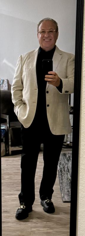 I just bought it. Tailored fit, nice raglan shoulder, bluish-grey R & G buttons, roll hems on sleeves give it an edgy look, pure cotton. A beautiful piece for the wardrobe.