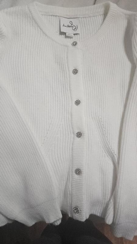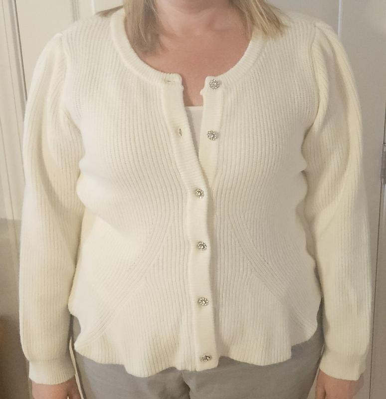 I received this color in a white knit. When I opened the box, the sweater had a very strange plastic smell to it but that quickly came out after one wash. The style is more of a peplum shape which I don’t think is flattering on everyone but it hits the body in an appropriate place to look as good as it can. The knit is heavy and feels high quality. The buttons are a pretty floral crystal that adds a special detail to the sweater. I don’t think I would have picked this sweater on my own but it’s a nice addition for the holidays.
