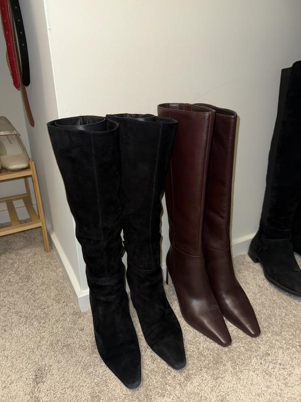 Bought black suede boots which were perfect! Size 6 medium width. I loved them so much I bought the brown leather boots, same size same width. I was soooo disappointed when I realized the brown boots were not only way too tight in the calf but also too tall in the shaft. See pictures. Unfortunately I didn’t notice this until it was too late as I’m never on the floor when getting dressed. The height of the boot shaft hits my knee everytime I walk which makes it really uncomfortable. The measurements and sizing is inconsistent which is a major design flaw.