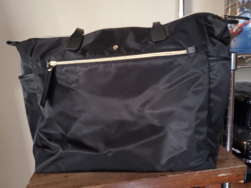 Great bag and perfect for travel. Lots of smart details. I have a huge laptop, it was hard to find a bag that would accommodate larger devices and still hold items I need for travel and work. This bag feel bottomless!