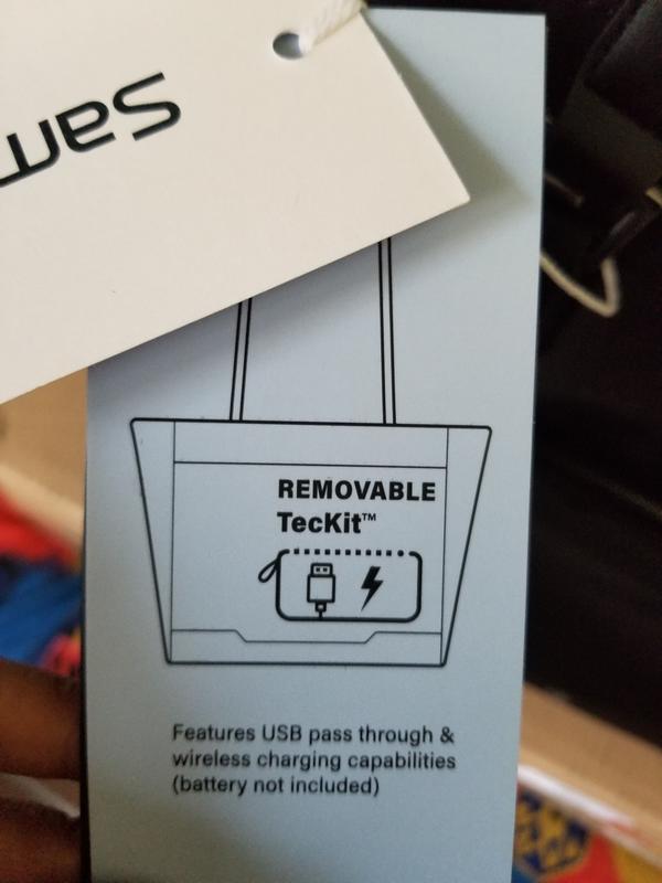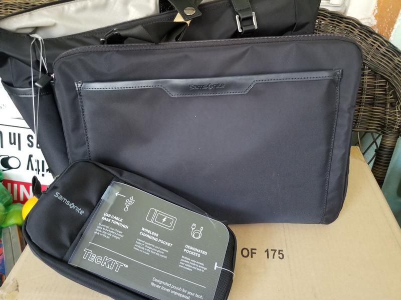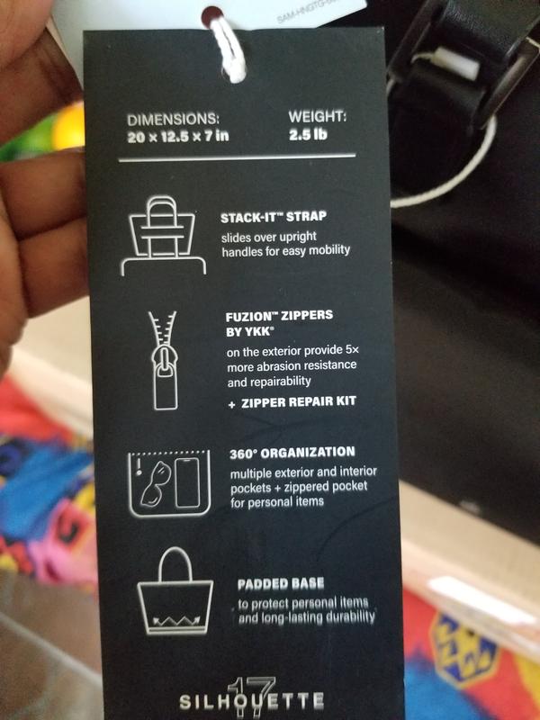 The description of the Tote is totally false! It said that it came with 8 spinner wheels, this item has NO wheels at all. That it had aTecKit Pouch to charge while on the go. There was NO TecKit at all. and that the tote had a tool kid to fix the zipper. NO contents described were found in the Tote Deceiving advertising.
