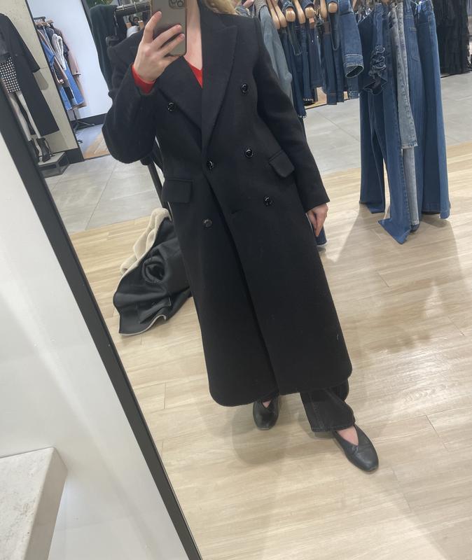 I wanted a Sandro coat for a long time and snagged this on sale. The shoulders are defined, it is heavyweight wool with structure, and the peacoat style is very flattering for larger busts. Deducted one star for two minor details; the pockets are faux, and the buttons have the Sandro name in white with an uneven brown line that looks like the button was scratched. This is a high-end coat; a simple black button would elevate the look. It may be worth the expense for a seamstress change the buttons.