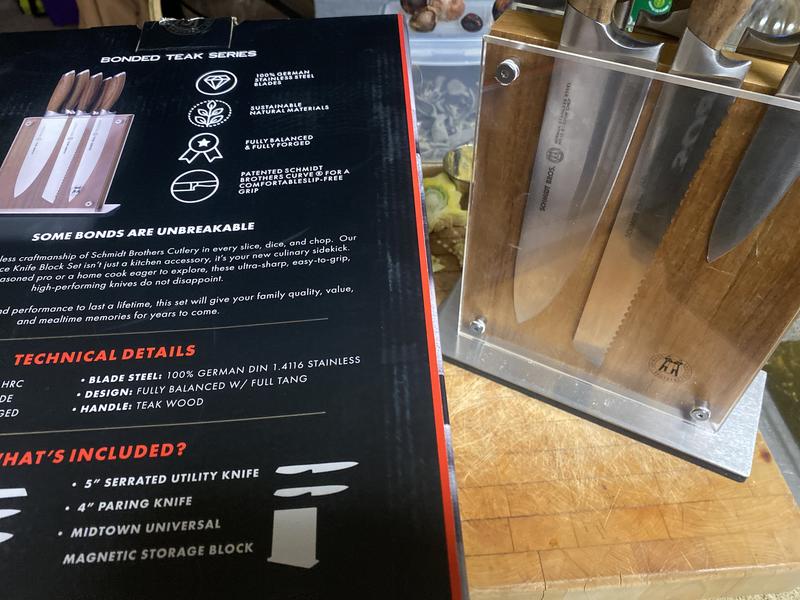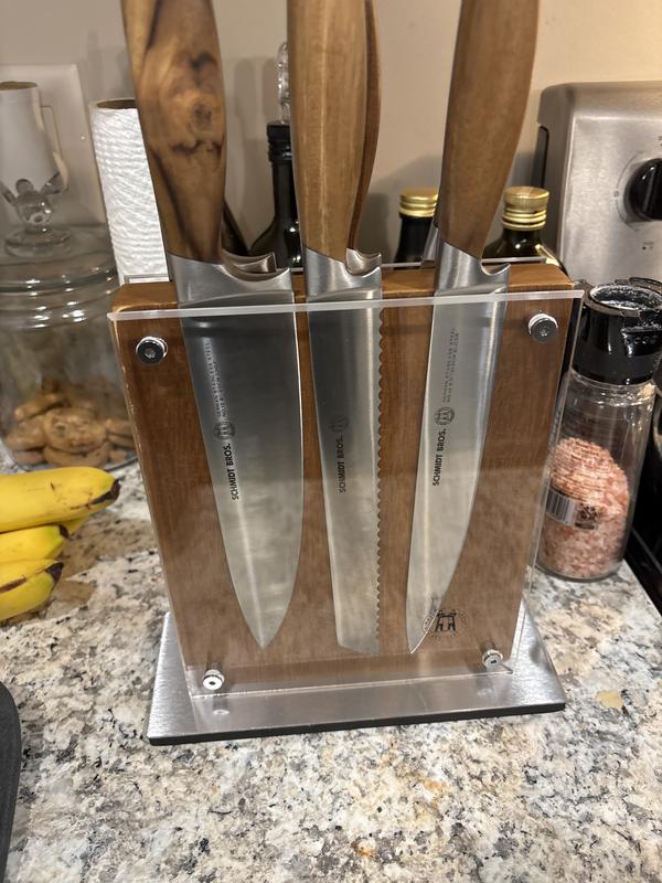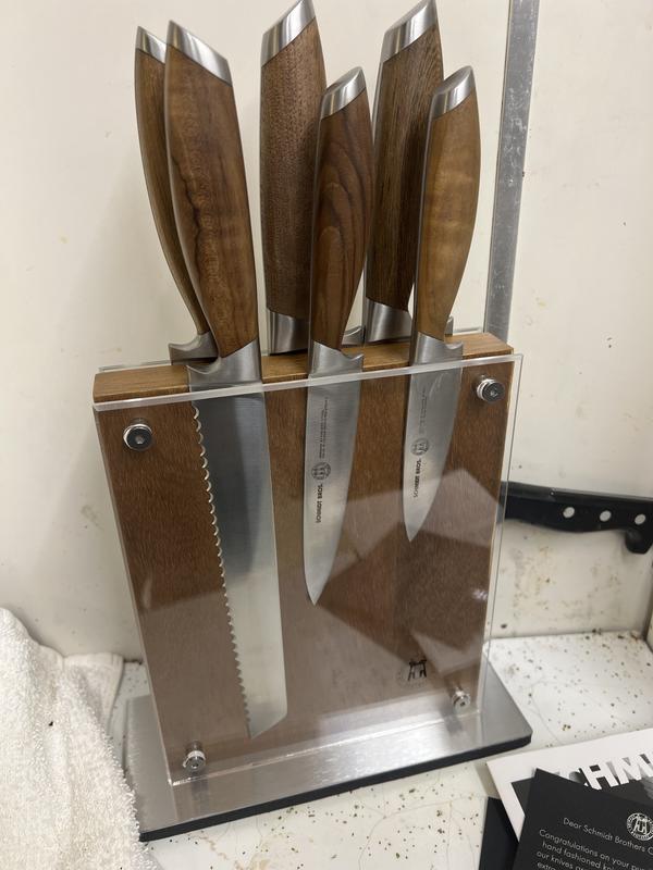 Knives are sharp and have the perfect weight in hands. The sleek look with wood handles is great.