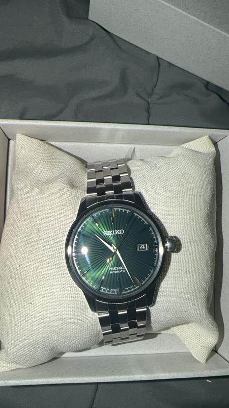 Stunning watch. Don’t listen to the other reviews about the bracelet. It feels heavy and high quality. Just some watch nerds. For a first watch or just part of the seiko collection, I think it’s worth the money. Maybe not $500 but I got it on sale and I’m pretty happy with my purchase. I love the skeleton back of the watch. It’s sleek and look expensive. Overall, it’s a sexy watch. The green dial is chefs kiss, the hands don’t tick and it’s just a smooth glide around the watch. The crystal frame is clean and feels sturdy. Love the crown of the watch, it’s super simple to change date and time. I could talk about this watch for hours it’s just so good. I’ll give another update in a couple of weeks to see how the watch is holding up but for now, it’s great! It’s came super fast btw. Literally less than a week. I can’t wait to gift this watch. Perfect gift for the holidays I must say. (Photo doesn’t do the color of the watch justice but still looks clean)