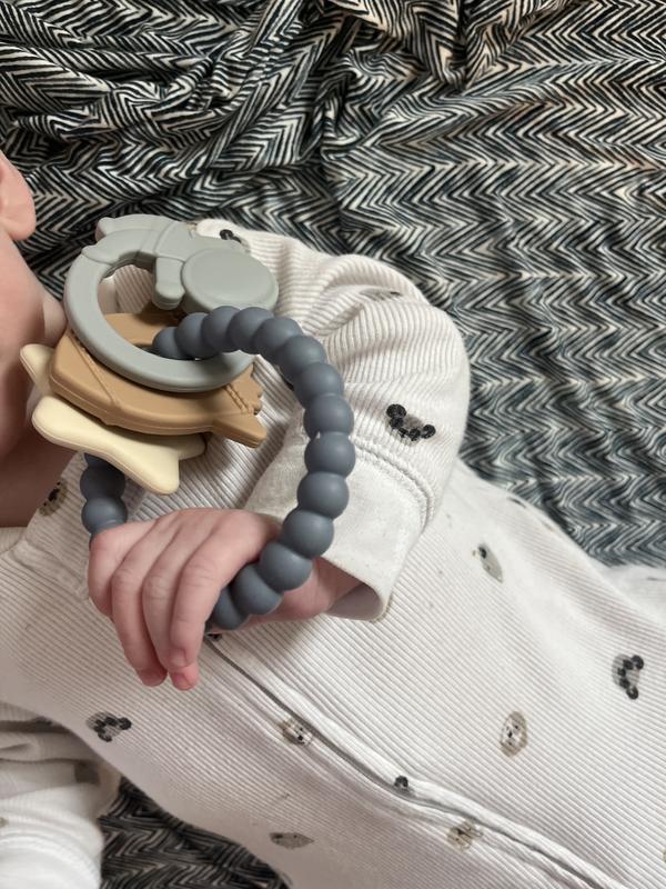 My 3 month old got this for Christmas and he loves it! I think he likes the texture of the balls and how the items move around on it. He swings it around and it keeps him entertained for a little while! It’s a great teether!
