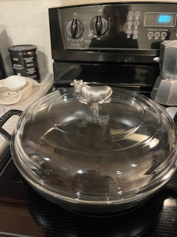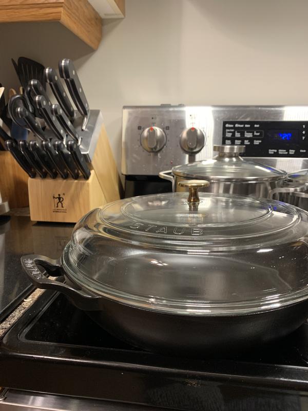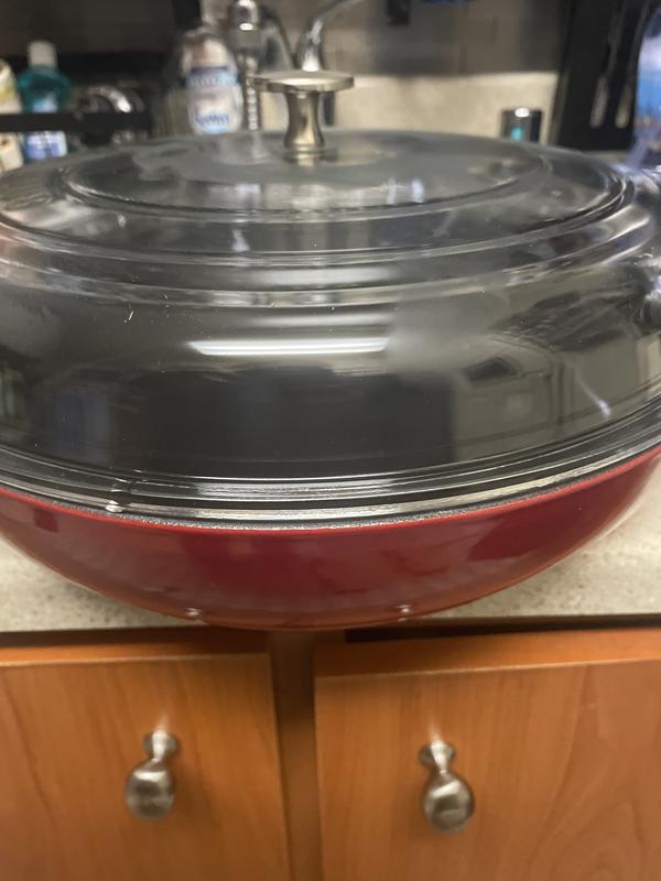 Beautiful braiser, deep enough for meats and liquids, glass lid is so helpful for watching a cook without having to release steam