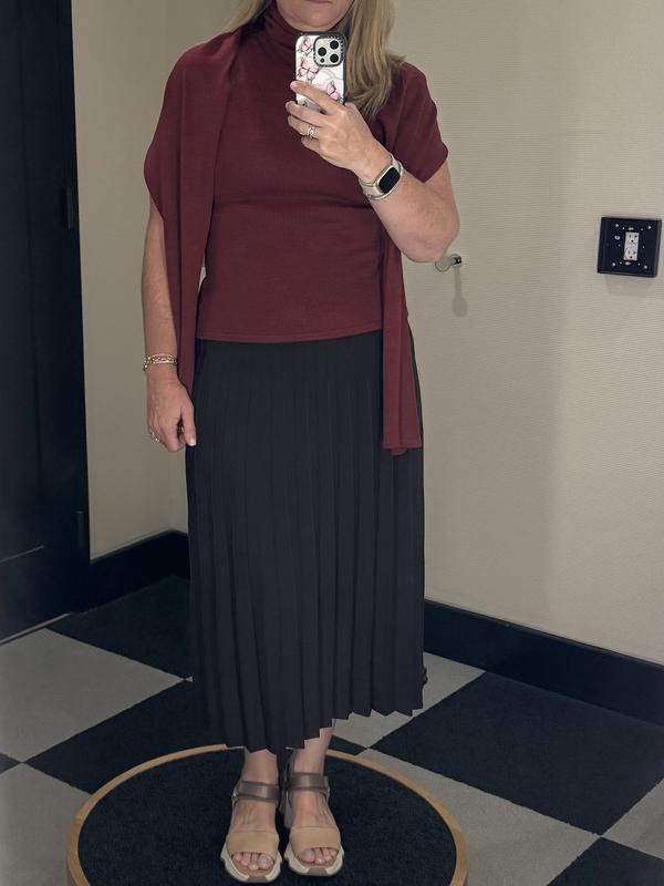 I tried this on at my local Bloomies. I am usually between a medium and large, and since this was very fitted I found that the medium was ok (that is the size in the photo) but sizing up to large would probably be a more comfortable/professional fit. Because it's a sweater knit type material there is stretch. The neck/sleeve cut was very flattering and the scarf is detachable (it has a little button on it to connect with the top if you'd like). The scarf can be worn in many different ways, including like a shawl to cover your arms a little, if you're a little older or not a size 0 ;) I tried it with a brown Lena skirt, and it was a great combo. I bought the skirt and am thinking about going back for the top with my reward $. The color is lovely and I like natural fibers, so the wool was perfect.