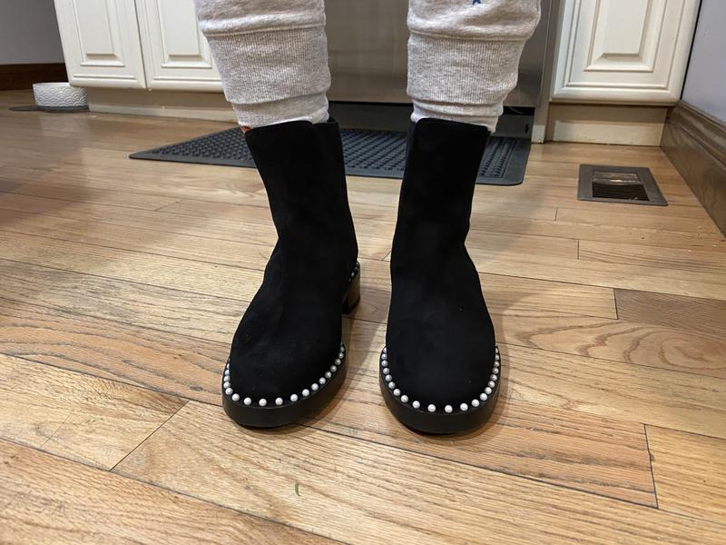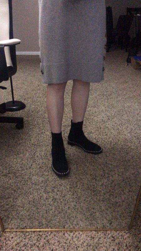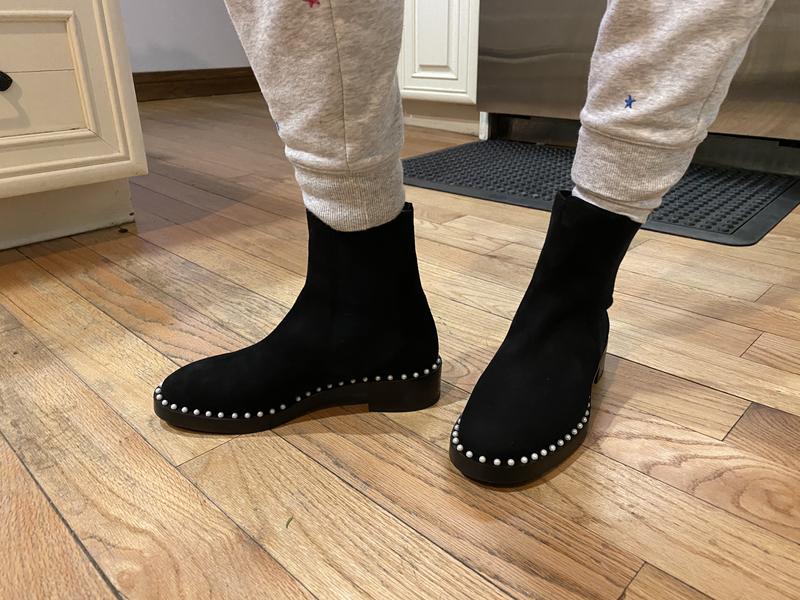 I have wanted these boots for the longest time and was thrilled when they went on sale and was able to get a pair in my size. My review is as follows: Style: super cute and very versatile (can be worn with pants, jeans, leggings, dresses, skirts) and they are so pretty to look at . 9 out of 10! Downhill spiral after their look.. Quality: 4 out of 10. They don’t look like the typical Stuart Weitzman quality I’ve been accustomed to in past purchases. The “elastic” part of the boots where you slip the boots on and off have a weird felt fabric on them that will have “pilling” on them after the first few wears. Also, the suede of the boot isn’t the greatest. Comfort: 1 out of 10. Omg! Are these uncomfortable!! I purchased my typical size in SW and my right foot slid in easy but the stiffness instantly pinched my whole foot to the point of an audible “Ow...my heel, ankle, and toes!” and my left foot would not and could not get in without me folding the boot at the ankle area and shoving it in. My foot still could not get all the way down into the shoe. I’m not sure if the left is defective or what! Conclusion: Still expensive at the sale price...wish I could get another pair to see if left shoe is a fluke but they are sold out. I’m bummed!