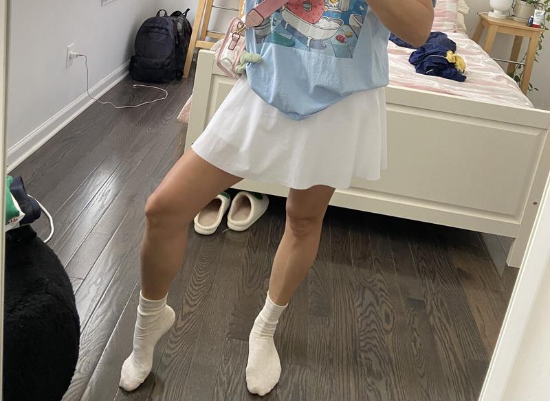 The fit, cut is very cute! Comfortable and lightweight. If you’re wearing anything that can transfer color, food, it’ll stain the white. I’m sure you’re like duh… no, the material on the shorts, not overlay-stains so easily. I laid a shirt on the skirt that had honey mustard on it. I tried to scrub it, it got fuzzies immediately. I soaked for hrs and then I tried bleaching it- it made the skirt turn orange. I have other white skirts. None has ever done this. I ended up buying another. We will see.