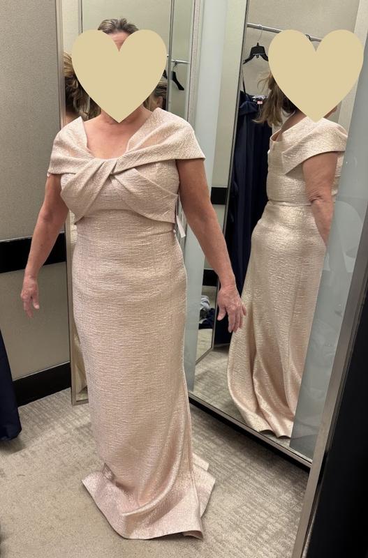 MOG dress for an Aug black tie wedding is pretty, fits well and the texture and fabric are beautiful. Was not 100% sure this is the dress b/c does not have all the glitz. I repurchased Champagne color. I can dress up w/ jewelry. Have to get the sides tailored. I went up to a size 8 from a 6 b/c snug around my swimmers back. I’m 125 pounds, 5 ft 6in. Highly recommend.